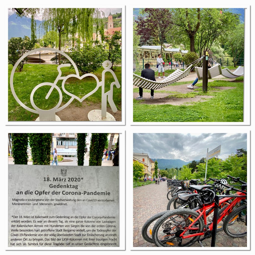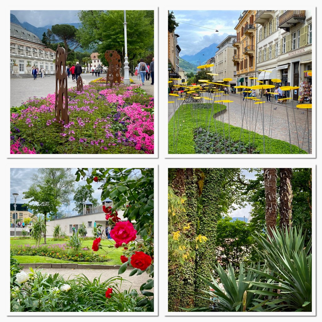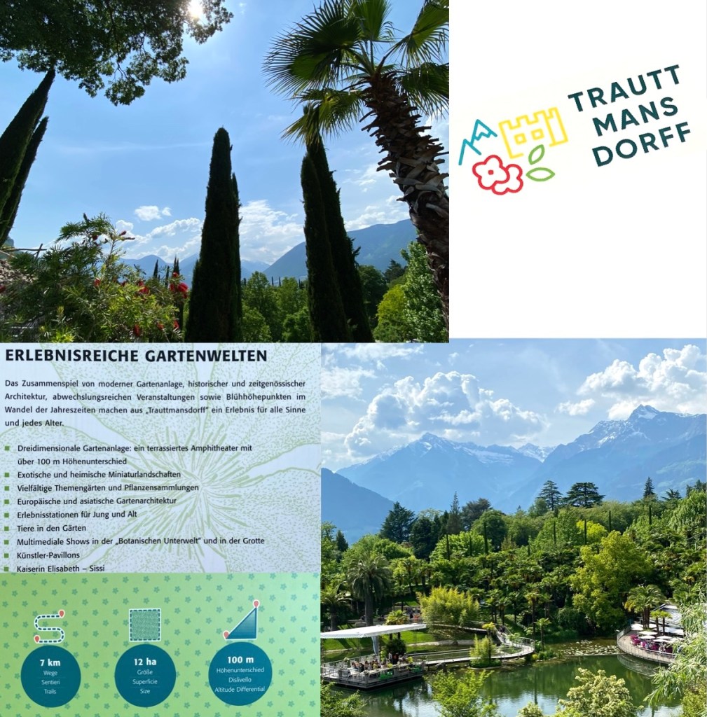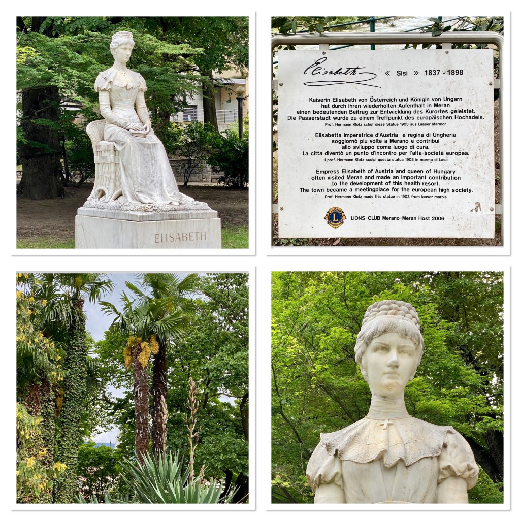 Letzte Eindrücke aus MeranMein letzter Spaziergang durch Meran – die LaubengasseZurück in Meran … das Jugendstil-Theater im AbendlichtDas Dorf liegt oberhalb von Bozen, der Blick runter ist super !Kleiner Ausflug nach Dorf TirolIch hatte mich beschwert, das Zimmermädchen hatte meine Zimmertür sperrangelweit offentstehen gelassen …. das war die Reaktion 👍Meine Zimmerdecke ist ein Sternenhimmel 😊Ein kleines, schnuckeliges Gebäude mit 12 GästezimmernMein Hotel ist ein Boutique-Hotel … zentraler gelegen geht nicht … gegenüber vom KurhausSo, das war’s jetzt mit der BotanikOh, ich liebe diese alten Plakate !Das Touriseum habe ich nur gestreift ….Schmeckt auch mit frischen oder TK-Beeren oder anderen Früchten aus dem Glas.Sehr lecker !Meran und im Besonderen Schloss Trauttmansdorff zählten zu den bevorzugten Destinationen der reisefreudigen Kaiserin Elisabeth on Österreich-Ungarn. Zweimal – 1870 und 1889 – weilte die Kaiserin, auch Sisi (oder fälschlich „Sissi“) genannt, dort auf Winterkur. In demselben Jahr erlebte Meran seinen ersten, vergleichsweise großen Ansturm an Wintergästen: Es begann der Aufstieg Merans zum Kurort von europäischem Rang.Die Gärten von Schloss Trauttmansdorff liegen am östlichen Stadtrand von Meran. Der Botanische Garten der Kurstadt Meran nimmt eine Fläche von rund zwölf Hektar ein. Natur- und Kulturlandschaften aus aller Welt, botanische Raritäten, Themengärten sowie lokale Vegetationsbilder des Landes Südtirols bilden die Schwerpunkte der Gartengestaltung. Im Vergleich zu vielen klassischen botanischen Gärten, die in der Ebene liegen, erstrecken sich die Gärten rund um das Schloss über einen Höhenunterschied von rund 100 Metern, aber mit 2 Fahrstühlen! Mit ca. 400.000 Besuchern pro Gartensaison steht der 2001 eröffnete botanische Garten an der Spitze der meistbesuchten Freizeiteinrichtungen Südtirols.Sonntagsausflug bei bestem Wetter in den Botanischen GartenEin Hauch von Sonne, als ich in Meran ankomme …Naturns auf der Rückfahrt … unten: das Wartehäuschen des Busbahnhofs ….. oben: ein Leckerli um die Wartezeit zu verkürzen ….Beim Feuer machen hätte ich gerne zugeschaut ….Unsere Vorfahren wussten die Natur zu nutzen !So war er wohl bekleidet & ausgerüstet.Im Gebäude wird vieles aus der „Ötzi-Zeit“ anschaulich erklärtDas Aussengelände ist liebevoll gestaltet – leider findet keine Vorführung (z.B. Feuer machen) statt.Mein Ziel heute …. es ist echt noch keine Saison … außer mir ist nur ein Ehepaar dort … es ist Samstag Nachmittag … und es regnet ….Ich war vor 25 Jahren schon einmal hier … und hatte es in allerbester Erinnerung !Die Landschaft im Schnalstal ist wunderbar Ein „Speck-Shop“ – Speck ist in Südtirol feinster Schinken …Die Löwenmäulchen mag ich besonders 😉Leider nieselt es …. und 16 Grad kann ungemütlich sein …. ich bin auf dem Weg ins Schnalstal und warte auf den Anschluss-BusWochenmarkt – Samstag – in NaturnsDurch die Innenstadt zu schlendern macht Freude Belle Epoque – das KurhausDie alte Postbrücke, ein Dreh- und Angelpunkt der Stadt.Ein Spaziergang entlang der PasserIch fange mal mit Sissi & dem Elisabeth-Park an ….Ich bin gestern hier eingetrudelt …..