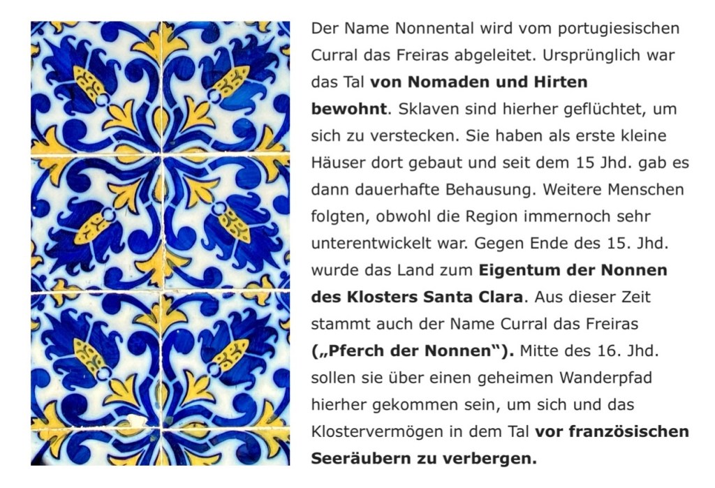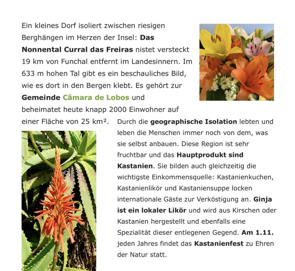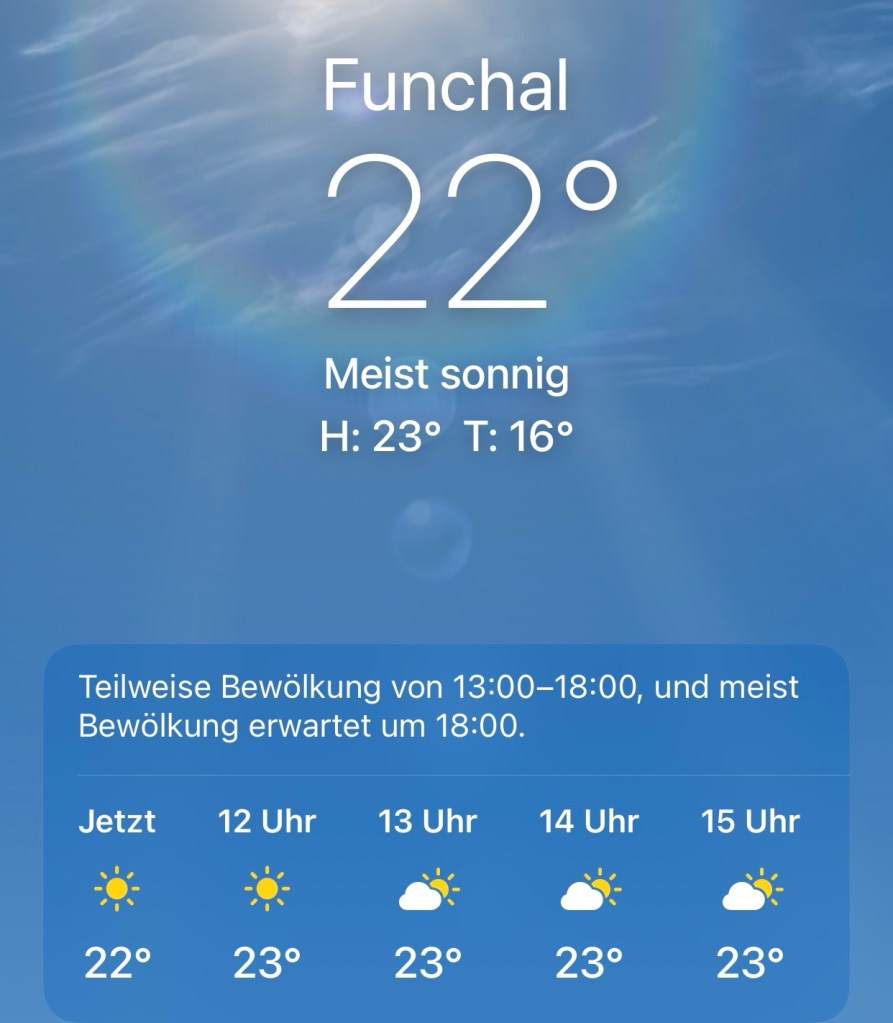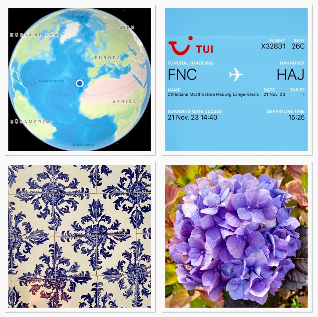 Wir beiden Christianes sind gut wieder in Hannover angekommen 👍Der letzte Wetterbericht vor dem Heimflug …Hier könnte man lecker Fisch essen 👍Kunst in der AltstadtEin Kunstprojekt verschönert die Türen des Altstadtviertels Zona Velha in Madeiras Hauptstadt Funchal. Seit 2011 gestalten Künstler die vormals oft etwas heruntergekommenen und tristen Eingänge im Zentrum der Stadt. Das Motto der Aktion lautet „Projecto artE pORtas abErtas“, die Kunst der offenen Tür, denn die gestalteten Türen sollen Funchal öffnen für Kunst und Kultur. Die Gassen der Altstadt werden so zu einem Freiuftmuseum. Graffito auf dem Weg in die AltstadtDie Kathedrale von Funchal – Se – ist das wichtigste religiöse Bauwerk des Madeira-Archipels und das meistbesuchte Denkmal in Funchal. Der Bau des Gebäudes auf Anordnung von König D. Manuel I. begann 1493 und wurde 1514 abgeschlossen, bereits vor diesem Datum wurden Messen im Tempel gefeiert.Die Decke der Kathedrale von Funchal misst mehr als 1.500 Quadratmeter. Die Holzdecke aus Alfarge (einem einheimischen Holz) mit Elfenbein-Einlegearbeiten im Mudéjar-Stil – orientalische Ornamente und Motive – welche die christianisierten Mauren auf der Iberischen Halbinsel verwendeten. Sie wurde gerade aufwendig restauriert.Von aussen eher unscheinbar: die Kathedrale Se. Sé ist die Abkürzung für Sedes episcopalis, Bischofsitz. Die Kirche wurde 1514 geweiht. Von außen wirkt der gotisch-romanische Bau eher schlicht und einfach, aber dieser Eindruck täuscht. Denn im Inneren sieht man üppige, vergoldete Holzschnitzarbeiten.Oben rechts – überall in Funchal wird der Weihnachtsschmuck angelegt … im Dezember muss es hier noch traumhafter sein …Überall gibt es kleine Parks & Gärten, Madeira wird ja auch Insel des ewigen Frühlings oder Blumeninsel genanntWir flanieren auf der Avenida ArriagaAzulejos sind Bilder aus bunt bemalten und glasierten Keramikfliesen in Portugal und Spanien. Diese wetterfesten Fliesen sind dort fester Bestandteil des Stadtbildes und werden an öffentlichen Monumenten und Gebäuden, Hausfassaden und Kirchen, aber auch an Innenwänden zu oftmals künstlerischen Wandbildern zusammengefügt. Häufig sind alte Blumen-, Vögel- und Schiffsmotive verarbeitet.An einigen Häusern findet man die berühmten Kacheln, die AzulejosFunchal ist die Hauptstadt der Insel Madeira die im atlantischen Ozean liegt. Der Name der Stadt heißt übersetzt „Fenchel“ – bei der Entdeckung durch die Portugiesen war die Gegend damit über und über bewachsen. Derzeit hat die Hauptstadt ca 114.000 Einwohner.Ich habe noch gar nichts über Funchal berichtet … hier traditionelle schwarz-weiße Ornamente auf KopfsteinpflasterDer Pool ist schön gross & der Blick vom Balkon superEin sehr geräumiges Zimmer DAS ist unser Hotel – kann ich empfehlen 👍… in einem der vielen Parks …Christiane schenkt mir 2 bemalte Kokosschalen, ich hatte sie wohl mehrfach interessiert in der Hand 😃Auf der Rückfahrt wird noch geshoppt … … und dann gibt es leckeren Kastanien-Eintopf mit der landestypischen Knoblauchbrot …Zuerst besichtigen wir die hübsche Kirche… und da ist schon eine Nonne 😂Dort unten liegt das Nonnental …