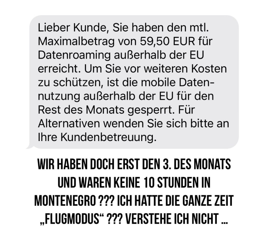 Nein, es geht übermorgen weiter …. Montenegro ist nicht in der EU – dann gildet mein Vertrag nicht 😯😯😯 (wird aber alles nachgeholt) .