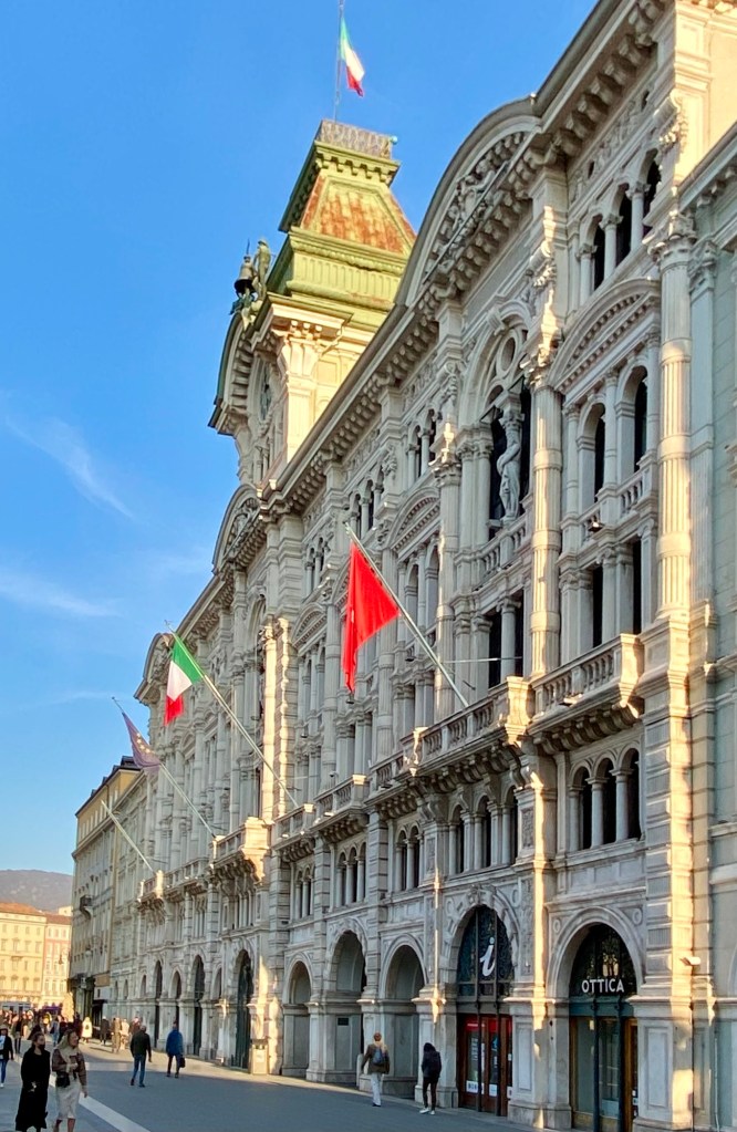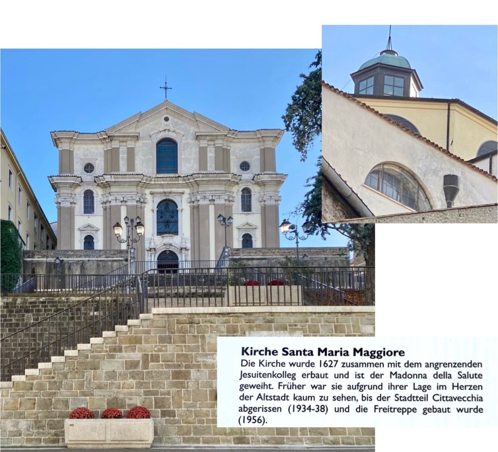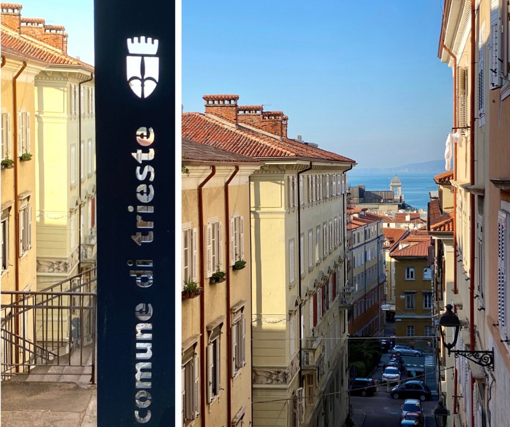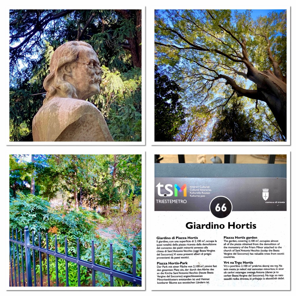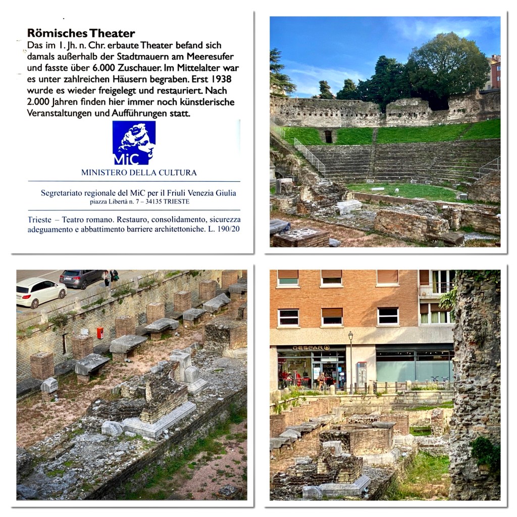 Triest ist eine Stadt der Bücher …Eine Passage in RathausnäheDas Denkmal Sterbender Krieger (1960) stammt von Marcello Mascherini. Mich verzückt immer das Mauerritzengrün 😄ImpressionenJetzt muss ich mich erstmal erholen … wie ??? Ich fahre Bus kreuz & quer durch die Stadt … das Tagesticket kostet 3.25 € !!!!Ein kleines, aber feines Amphi-Theater 👍Und dann kraxele ich eine andere Treppe wieder runter 😎Die Basilika San Silvestro ist die älteste Kirche in Triest, sie wurde im 12. Jh. im romanischen Stil erbaut. Im inneren sind noch Fresken aus dem 14. Jh. erhalten. Nach der Schließung vieler katholischer Gotteshäuser durch Kaiser Josef II. von Österreich wurde sie 1784 an die Evangelische Gemeinde H. B. verkauft,Dreissig Meter neben dem Hotel geht es diese Treppe hoch ….Mir gefallen die Schornsteine hier sehr gut 😄Alle Fotos von Triest habe ich bei Spaziergängen rund um das Hotel (etwa 3 km Radius) gemacht !!!Das RathausDa ist sie nochmal …Griechisch-orthodoxe Kirche San Nicolò – Nach der Trennung der beiden lokalen orthodoxen Gemeinden wurde eine Kirche mit Blick auf den Golf erbaut, um die Verbundenheit der Glaubensgemeinschaft mit dem Mutterland und der Quelle ihres erfolgreichen Handels – dem Meer – zu unterstreichen. Sie wurde 1787 eingeweiht und um 1820 von Matteo Pertsch im klassizistischen Stil neu gestaltet.Eine der beiden Orthodoxen Kirchen der StadtIch wusste nicht, dass es schwarze Tauben gibt ….Die beiden parken genau davor 😄Eines der altehrwürdigen Kaffeehäuser – im 1825 eröffneten Café ist noch ein Teil der Stuckarbeiten und der Wiener Atmosphäre des 19. Jh. erhalten. Es war das erste Lokal der Stadt, in dem Eis serviert wurde: In einem Brief an seine Freundin Nora Baldi schwelgt Umberto Saba 1953 in Erinnerungen an „köstliches Pistazien-Eis, das man heute auf der ganzen Welt – wie ich glaube – vergeblich sucht.“Die „Nieuw Statendam“ der Holland America Line (etwa 3x so gross wie die Amera)Nicht nur in Venedig, nein auch hier beginnt der Protest gegen die Kreuzfahrer 😯Oh … ein neues Kreuzfahrtschiff😋😋😋Besonders prägend für die Entwicklung der Stadt waren die mehr als 500 Jahre Zugehörigkeit zur Habsburger Monarchie, in die der enorme wirtschaftliche und kulturelle Aufstieg des „kleinen Wien an der Adria“ fällt. Nach dem Ersten Weltkrieg kam Triest zu Italien.Am Canale Grande von TriestDer Blick aus meinem Fenster – genau hier beginnt die Altstadt – Zeitgeist auf antiken Fundamenten Urban Hotel Design Hier spürt man den Atem der Geschichte und zugleich den Puls der Zeit. Das Designhotel des 21. Jh. profiliert sich mit kühl gestyltem Komfort und eröffnet durch einen gläsernen Fußboden in seinem Frühstücksraum die Aussicht auf seine römischen Fundamente.Tolles Frühstück (€ 12)Das Einzelzimmer € 82 👍Mein Hotel mitten im Zentrum – der rote Teppich wurde extra für mich ausgerollt 😃😃😃 – unten rechts = Glasboden, das Hotel steht auf römischen Ruinen 😯😯😯Das Wetter ist freundlich 😄Strassenstände an vielen Stellen, weniger richtige Märkte, sind mir begegnet …Die Treppe der Via Ciamician bietet einen der beliebtesten und am meisten fotografierten Ausblicke auf den Golf von Triest. Ursprünglich hieß die Straße Via degli Armeni. Grund dafür war die in diesem Bezirk stark vertretene armenische Gemeinde, zu der auch der Chemiker und Wegbereiter der Solarenergie Giacomo Ciamician (1857-1922) gehörte.Die Häuser in Triest sind grandiosDas Sissi-Denkmal am Hauptbahnhof, sie hat hier ihre Schiffsreisen nach Korfu & Madeira begonnen – Triest war der einzige Hafen der Habsburger am Mittelmeer Seit den 1960er Jahren ist Triest durch seine vielen internationalen Organisationen und Einrichtungen einer der wichtigsten Forschungsstandorte Europas, eine internationale Schul- und Universitätsstadt und hat einen der höchsten Lebensstandards unter Italiens Städten.Einpaar erste Eindrücke Triest ist im Aufbruch. Am Aufblühen. Seit das Anlegen von Kreuzfahrtschiffen im 160 Kilometer entfernten Venedig eingeschränkt wurde, kommen immer mehr Dampfer mit Reisenden hier an. Der Golf von Triest, der sich vor der weitläufigen Piazza dell’Unità d’Italia erstreckt, ist wie gemacht dafür: Das Meer ist hier rund 15 Meter tief.Die Stadt ist wunderschön Schön und kultiviert, ist Triest die kosmopolitischste Stadt Italiens. Überall ist die glorreiche Habsburger Vergangenheit zu fühlen. In ihr kreuzen sich Sprachen, Völker und Religionen, die sie immer noch auszeichnen und ihre mitteleuropäische und zugleich mediterrane Seele erahnen lassen.