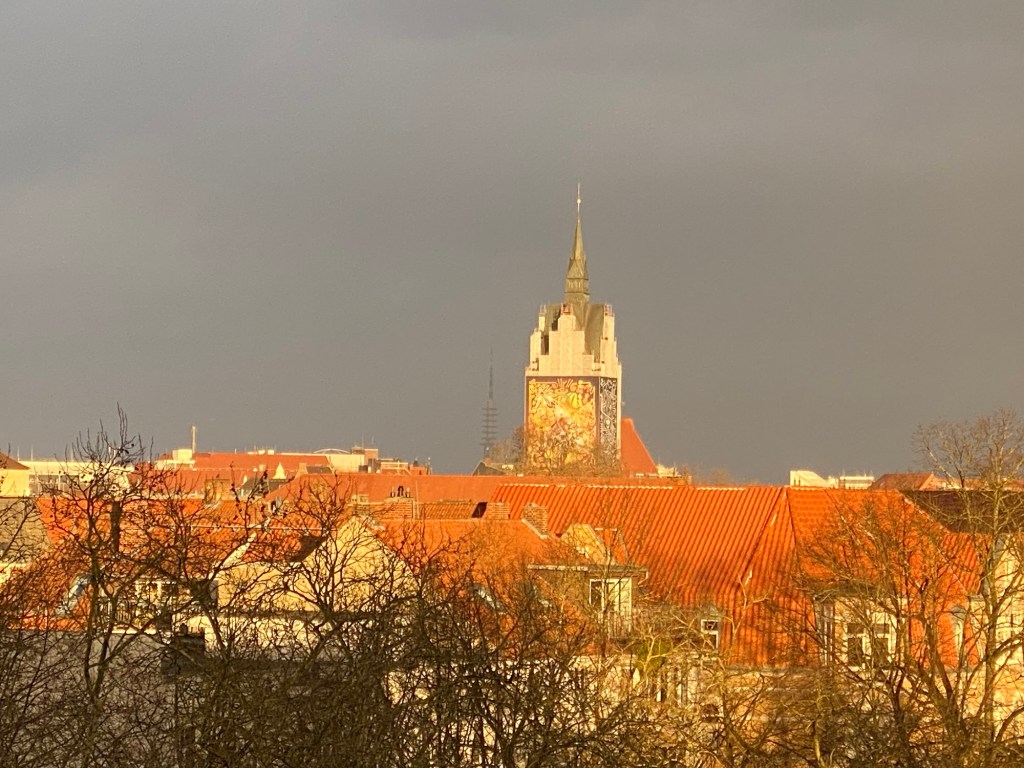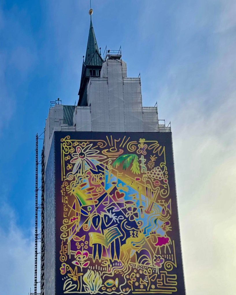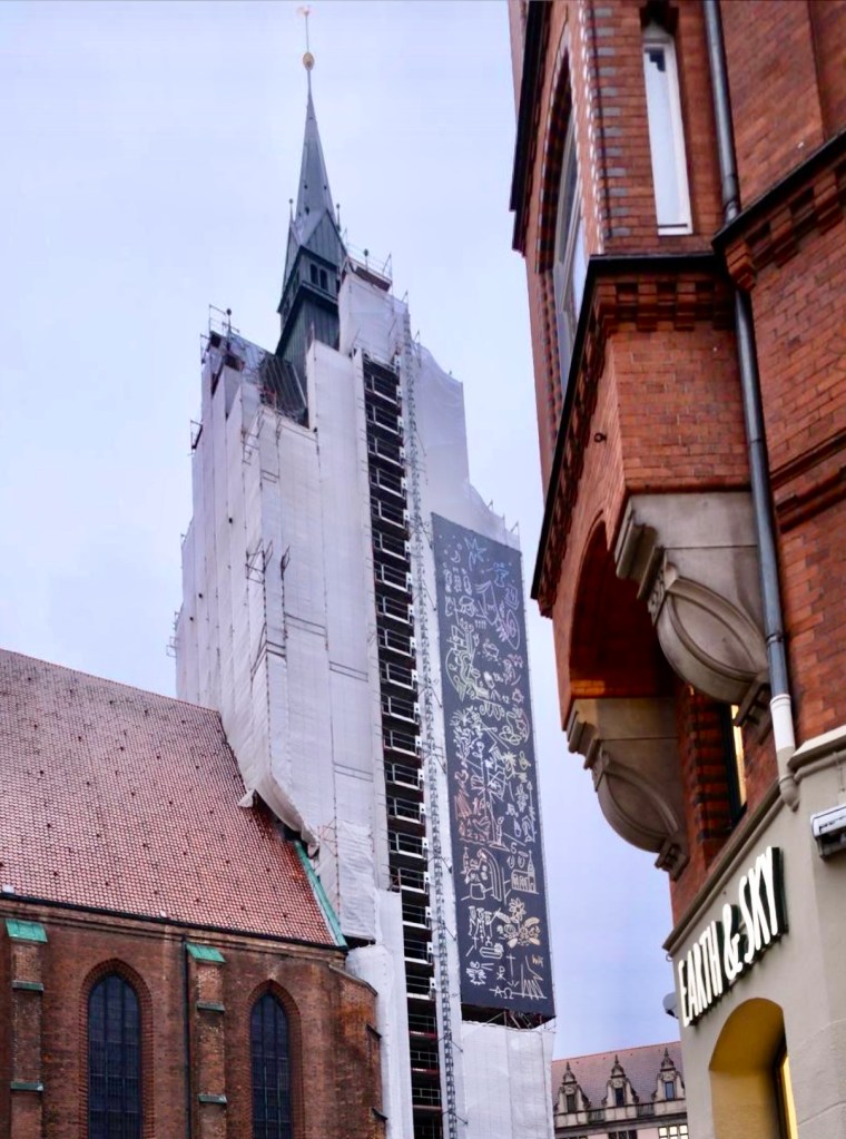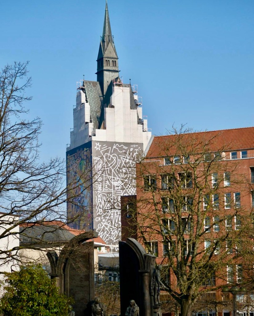 Das Kunstwerk am Turm des Gotteshauses ist ein echter Hingucker: „Triptychon“ des hannoverschen Künstlers Sebastian Peetz. Die drei Planen sind jeweils 30 Meter hoch und bis zu 20 Meter breit. Insgesamt bringen sie 1241 Quadratmeter Kunst an die Kirche.