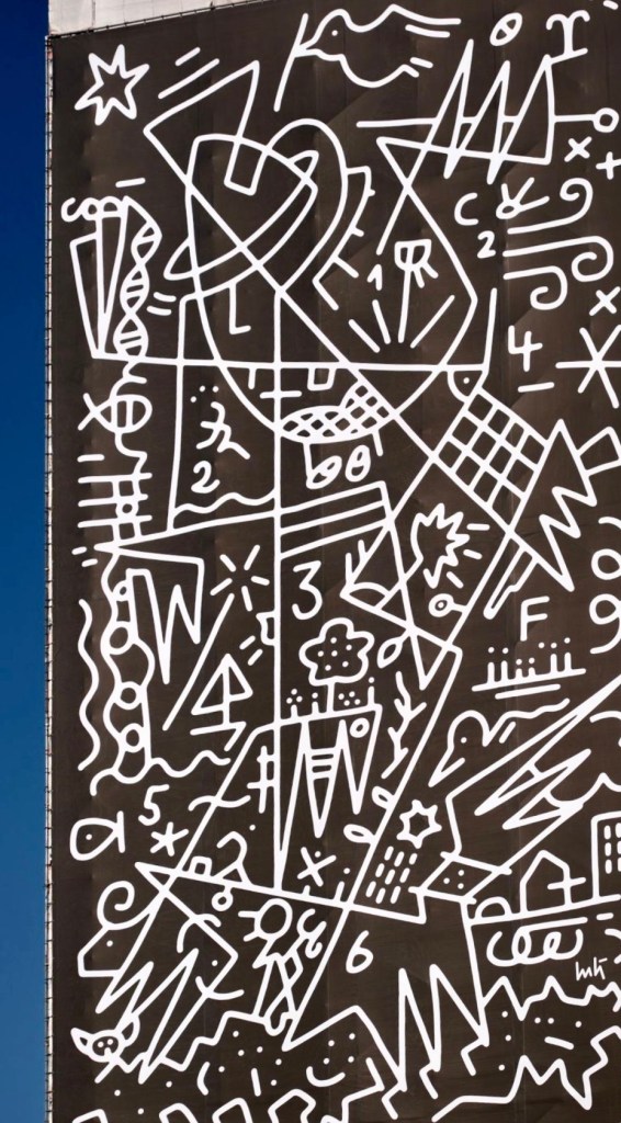 Das weniger farbige Werk an der Südseite des Turms: „Exitus Genesis“ genannt, soll zur Bewahrung der Schöpfung aufrufen. Unter anderem zeigt es ein Flüchtlingsboot, den Schriftzug „CO“ und eine Friedenstaube, sowie diverse Symbole, die grafisch ein wenig an die Kunst von Keith Haring erinnern.