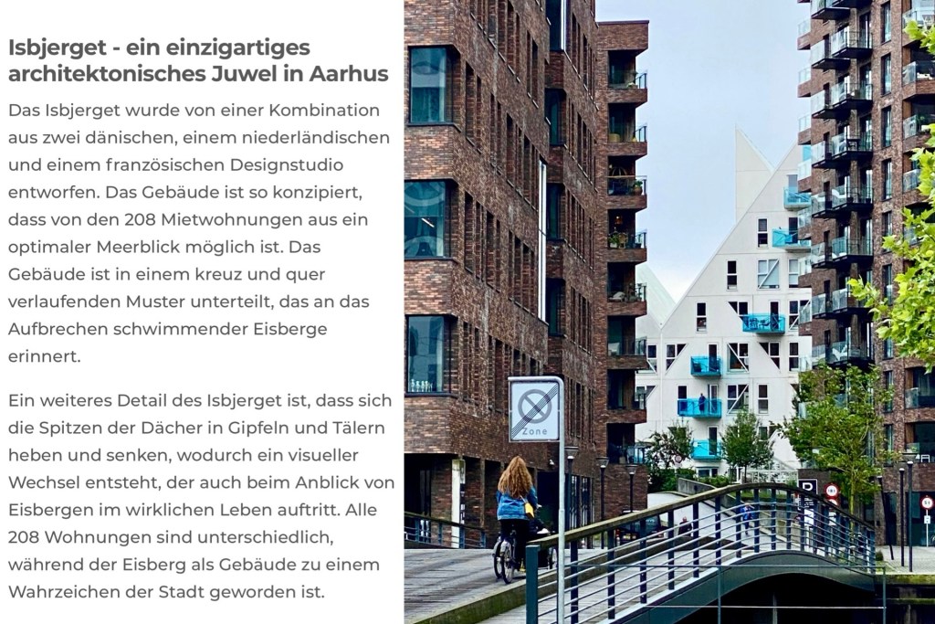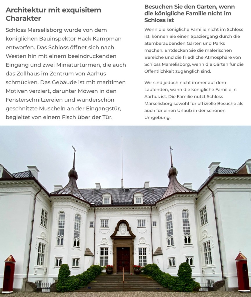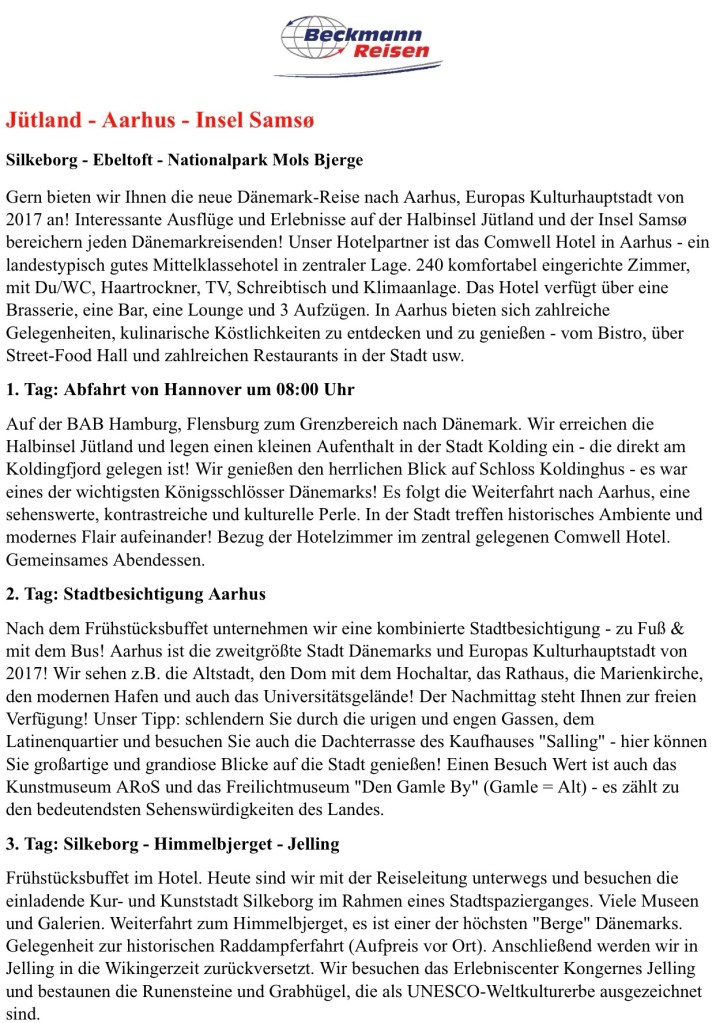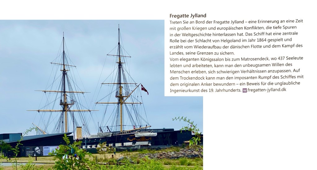 Wir sind gut durchgekommen und waren sogar 30 Minuten früher als angekündigt wieder in Hannover am ZOB !!!Königliche Hoheiten Anno Dunnemals beim Flanieren am Kolding Fjord mit Koldinghus auf der AnhöheEs gibt einen entzückenden Museumsladen 😂Das berühmte Service ist hier ausgestelltWir werden ohne Eintritt zu bezahlen reingelassen, da wir die Toiletten besuchen möchten 👍Es gibt hier ein wichtiges Schloss, mehr eine BurgEin hübsches StädtchenHerr Beckmann ist das erste Mal hier und muss sich mit dem grossen Bus auch erstmal zurecht findenAuf der Heimreise machen wir einen Stopp in Kolding am KoldingfjordEin Katalogbild … das neue Stadtviertel vom Wasser aus gesehenDer lange Spaziergang durch dieses Neubauviertel hat mich begeistertHier ragen überall Kräne in den HimmelEntdecken Sie Aarhus‘ neuen Stadtteil – Aarhus ÖHier sieht man in der Ferne: Leuchtturm & ein bisschen vom Eisberg, unser nächstes ZielEcht Glück gehabt, dass es nicht geregnet hat !!!Im Hintergrund: unser Comwell HotelDas war mein Mittagessen im Restaurant oben, Salat mit Pilzen & HühnchenEin echter Rundum-Blick, 360 Grad Aarhus 👍Feine SitzeckenSpaziergang durch die InnenstadtShopping in der Fussgängerzone: Filzuntersetzer für meine Küche in grün 😄Das TheaterIm Schlossgarten die Statuen / Kunstwerke sind von Prins Henri, dem Prinsgemahl von MargareteStadtrundfahrt Aarhus … wir beginnen mit Schloss Marselisborg … wenn sich die königliche Familie in Schloss Marselisborg aufhält, findet jeden Tag um 12.00 Uhr eine Wachablösung mit der königlichen Leibgarde statt.Das war unser Ausflug in den Nationalpark 👍👍👍Interessante EisvariantenDer Sletterhage Leuchtturm ist der letzte Stopp heuteOk, die Sehenswürdigkeiten von Ebeltoft habe ich verpasst, aber es war ein sehr vergnüglicher Aufenthalt 👍Ich mache es mir in einem Surfer-Laden auf einem weichen Sofa gemütlich und ein sehr netter, gutaussehender Surfer aus Hildesheim, der dort lebt, bereitet mir eine Waffel mit Vanilleeis & Schokososse, dazu Cappucino … was will frau mehr 😄😄😄Leider regnet es in Ebeltoft … ich entscheide mich die stadtführung zu schwänzen, man gut … die Gruppe kommt triefnass zurück 🫢Impressionen „Mols Bjerge Nationalpark“Einige Pferde grasen im UmkreisDiese Beschreibung fand ich am Besten, auch wenn sie zu lang ist … 🤷🏻♀️Dann kommen wir zu einem „Steinhaus“Schöne Landschaftsfahrt mit sanften HügelnUnser erster Stopp ist die Küste bei der Ruine KalöWir fahren an Rönde vorbeiÜberall an der Küste: Ferienhäuser 👍Naja, ein wenig geregnet hat es schon bei unserem Ausflug in die Ebeltofter Bucht und ins Djursland …Aber das angekündigte Unwetter hat uns verschont und wir haben mit dem Wetter Glück gehabt 👍Das war die ausgeschriebene ReiseDas Programm wurde wegen der Unwetter Warnung verschoben