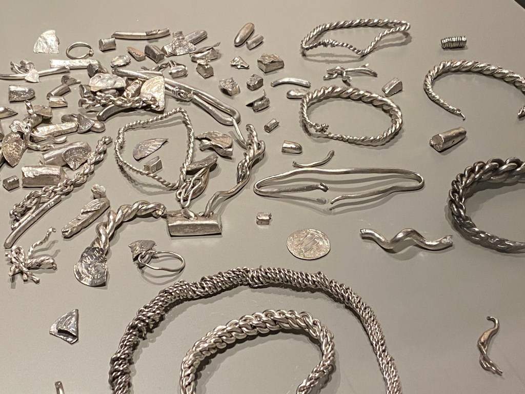 Hacksilber: Silbergegenstände wie Schmuck, Münzen oder Barren, die im Mittelalter als eine Form von vormünzlichem Geld dienten. Der Wert eines Stücks Hacksilber ergab sich aus seinem Gewicht, das für den Handel abgewogen wurde, anstatt dass die Gegenstände einen festgelegten Nennwert als Münzen hatten.