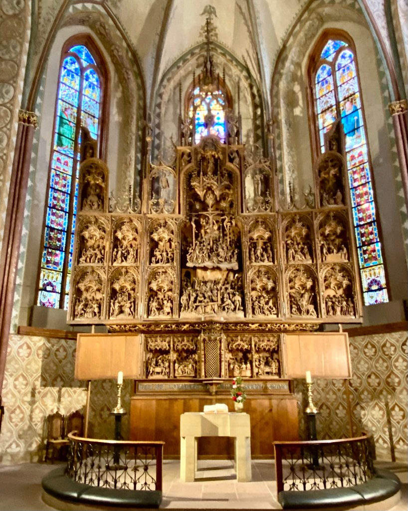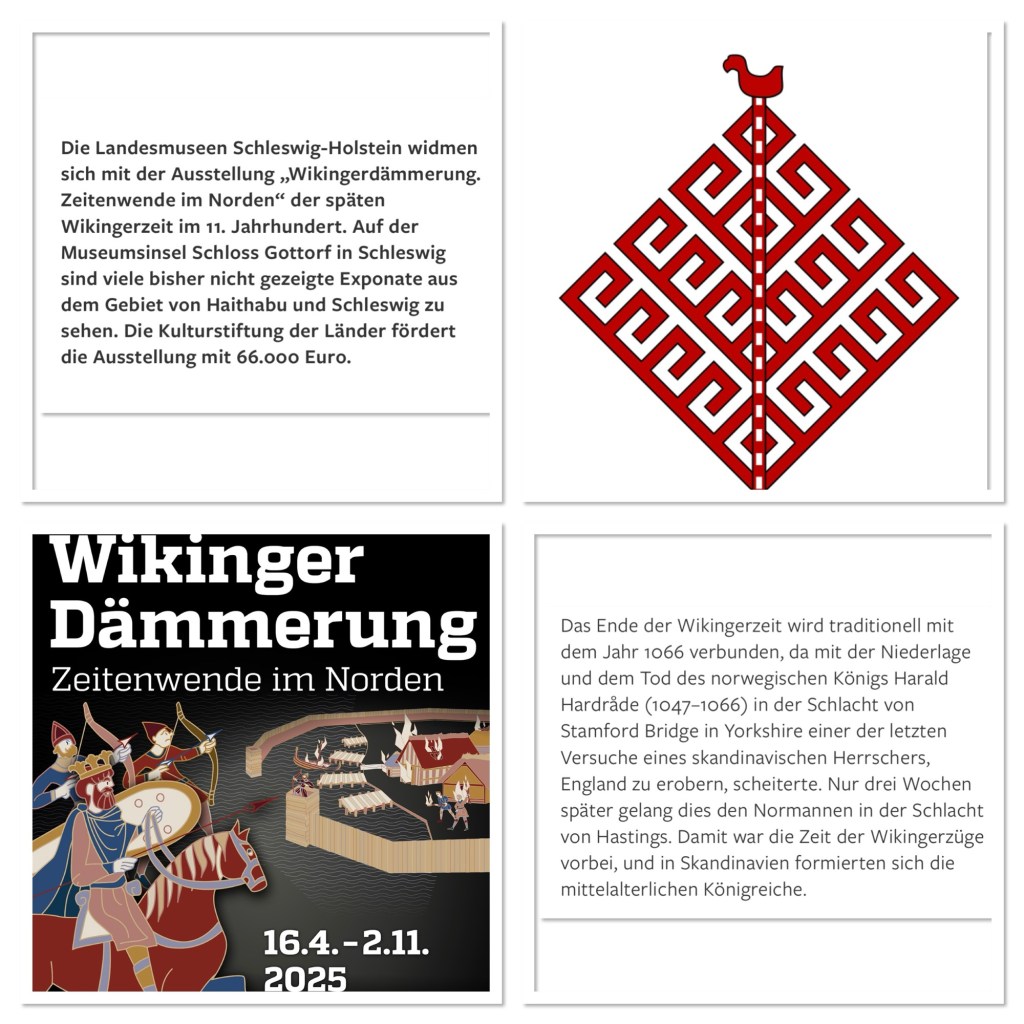 Die Getränke im Museums Coffeeshop 😆Daaa isses endlich, das Museum 😃Igitt – ein längerer FussmarschAuf dem Weg nach Haithabu verlasse ich mich auf den Nahverkehr … ich steige an der falschen Haltestelle aus, weil der Busfahrer so blöd reagiert 😠😠😠Unglaublich fein gearbeitet Sooo viele verschiedene Steine …Der Turm ist eindeutig zu hoch … den kriegt man nur sehr schwierig aufs Foto 😆Ich bin auf dem Weg zum DomJaaa, die Stockrosen … sie blühen noch … ich war vor etwa 15 Jahren schon einmal in Schleswig und habe die Stadt als „Stadt der Stockrosen“ in Erinnerung !!!Ich kenne das aus Alaska, von den Inuit & Indigenen – faszinierendMan stösst auf sehr interessante Läden & aussergewöhnliche Werkstätten – Fischhaut wird hier ja echt selten verarbeitetDie Häuser des Holm liegen entweder direkt am Wasser, oder sie scharen sich rund um den FriedhofEs gibt hier sehr schnuckelige Ecken😄😄😄 Die Stockrosen blühen noch 😃Der erste Teddy 😄In Schleswig gibt es ein Teddy-Bär Museum !!!Der Runenstein von Jelling … da war ich vor 2 Monaten 😃 … ich belasse es mal dabei, die Ausstellung war natürlich viel grösser …Wichtig: die Wikingerhelme hatten keine Hörner, das war eine Erfindung der Bühnenbildner der Wagneropern … es sollte dramatischer aussehen 👍 Der Schatzfund von List auf Sylt ist ein 2012 auf dem Fliegerhorst bei der Einebnung einer Dünenkuppe entdeckter Silberschatz aus der wikingerzeitlichen sogenannten sogenannten Kuhhorn-Gruppe. Er wurde in einem Kuhhorn mit Bleideckel gefunden.Die Wikinger waren grossartige Schiffbauer & weit gereiste Händler … das Wort Wikinger bedeutet „Räuber“ – ist also eine Art Berufsbezeichnung … keine Ethnie oder Volk 👍👍👍Schrein aus Walrosselfenbein mit vergoldeter BronzeSchatzfund von Morsum, Eigentum einer Person, die im Nordseegebiet zwischen Norwegen, Dänemark und England unterwegs ist.