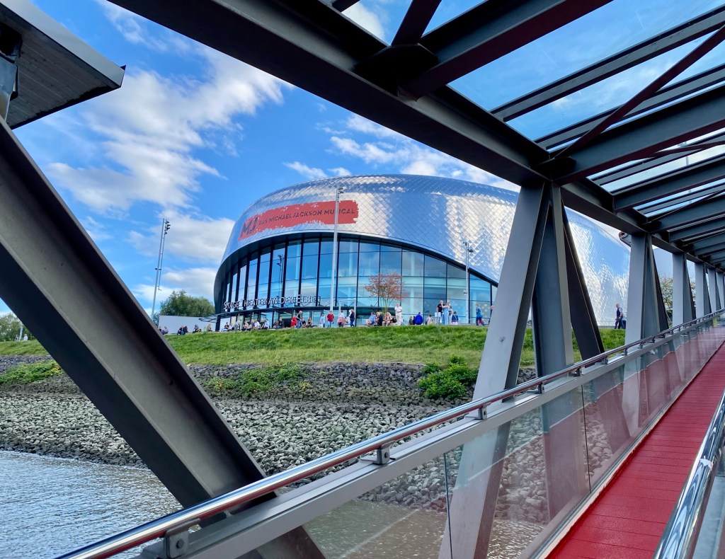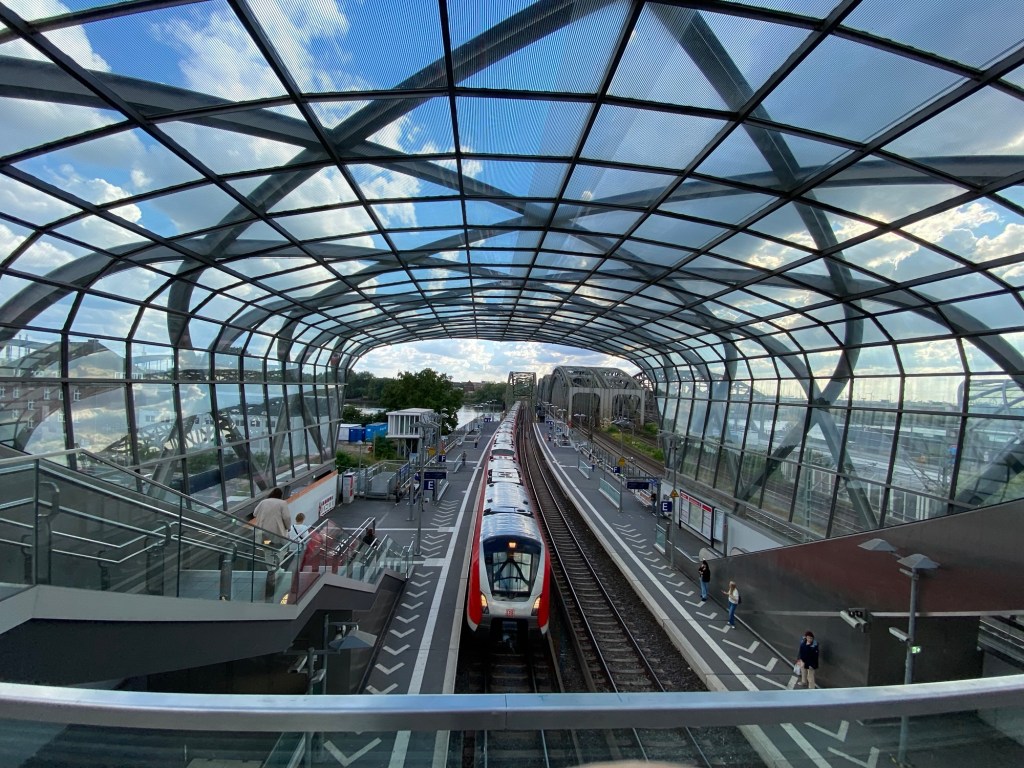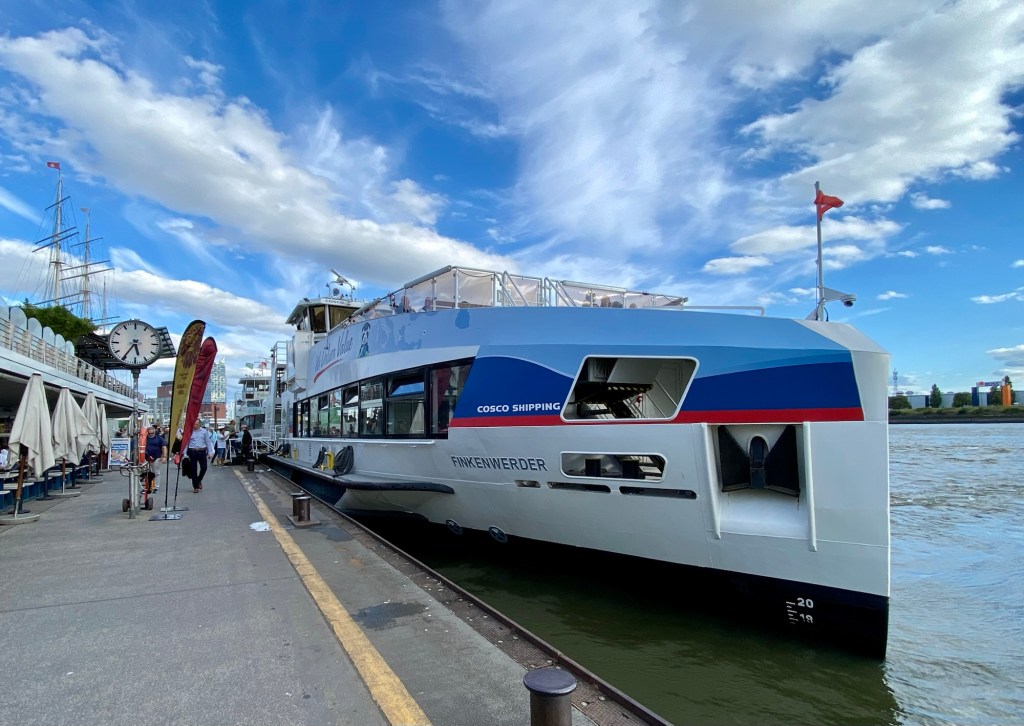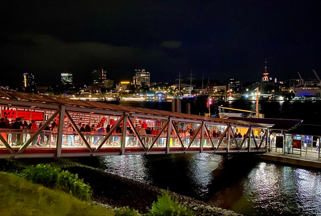 Die Linie 151 von Wilhelmsburg nach Altenwerder der Hamburger Hochbahn ist die einzige Buslinie, die über die Köhlbrandbrücke führt. Das Kreuzfahrtschiff ist die „Mein Schiff 4“ von der TUI.