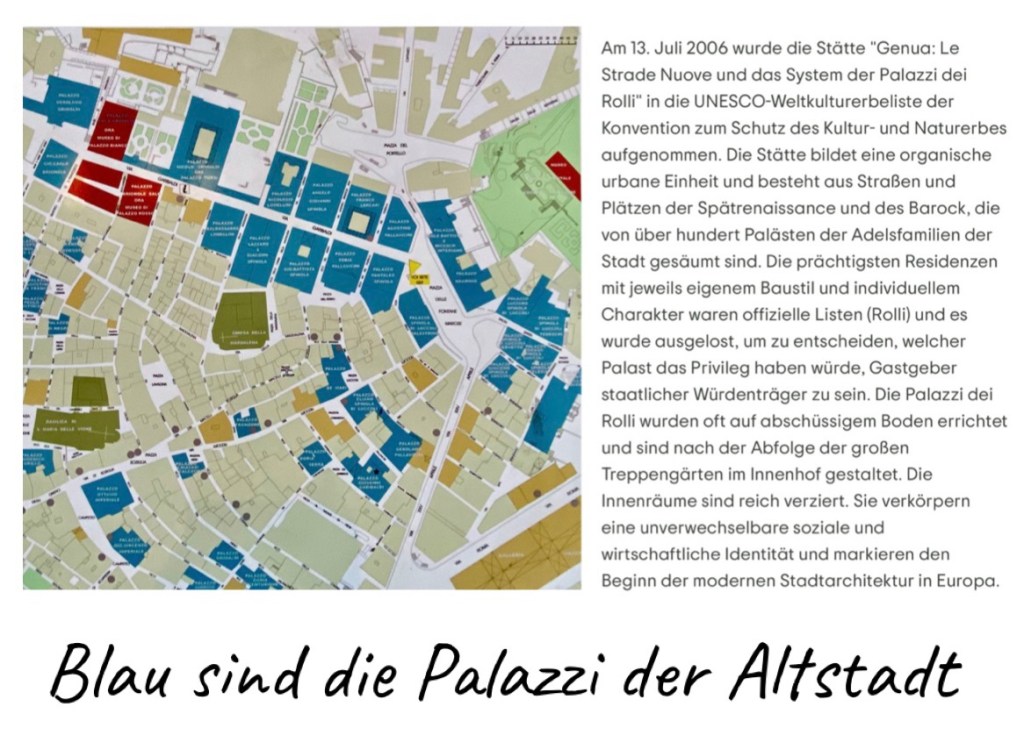 Genua ist hat einen unglaublichen Reichtum an prächtigen Fassaden mit Stuck-, Marmor- oder bemalten Verzierungen, grandiosen Atrien, prächtigen Gärten mit Springbrunnen und Nymphäumen; und im Inneren große Säle mit Fresken, prächtige Möbel, wertvolle Sammlungen und reiche Gemäldegalerien.